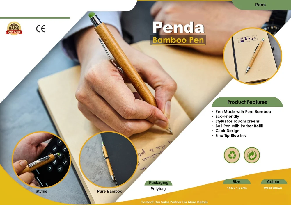 The FUZO Penda Bamboo Pen is a stylish, eco-friendly writing instrument crafted from natural bamboo, making it lightweight and comfortable to hold. It features a click-action mechanism and a fine tip blue ink ballpoint that delivers smooth writing performance. The pen also has an integrated stylus tip for effortless touchscreen use on smartphones and tablets, blending traditional writing with modern functionality — ideal for office use, student notes, stationery kits, and corporate gifting